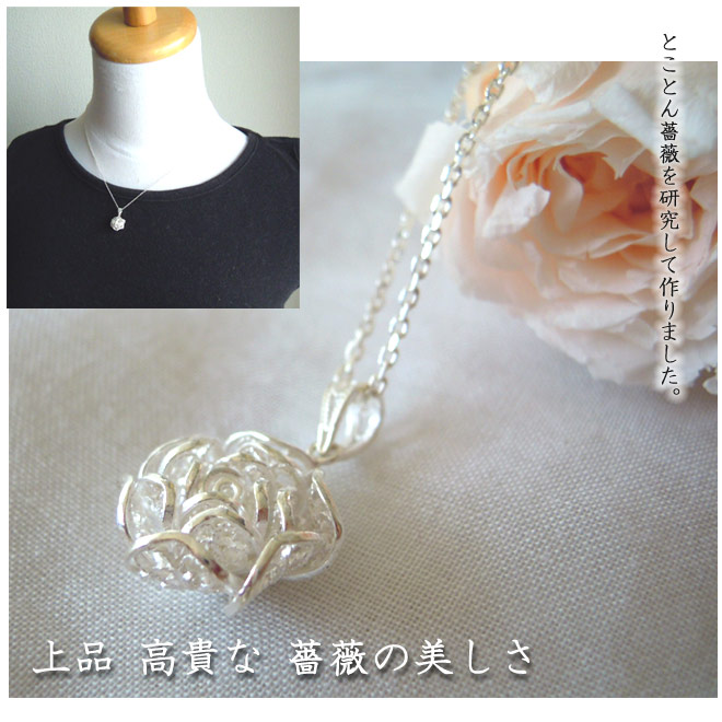 ローズチャームネックレス|銀線細工で作った繊細な透かしの花びらを重ねた美しい薔薇・バラのシルバーネックレスsilver925 [ch49p-si]