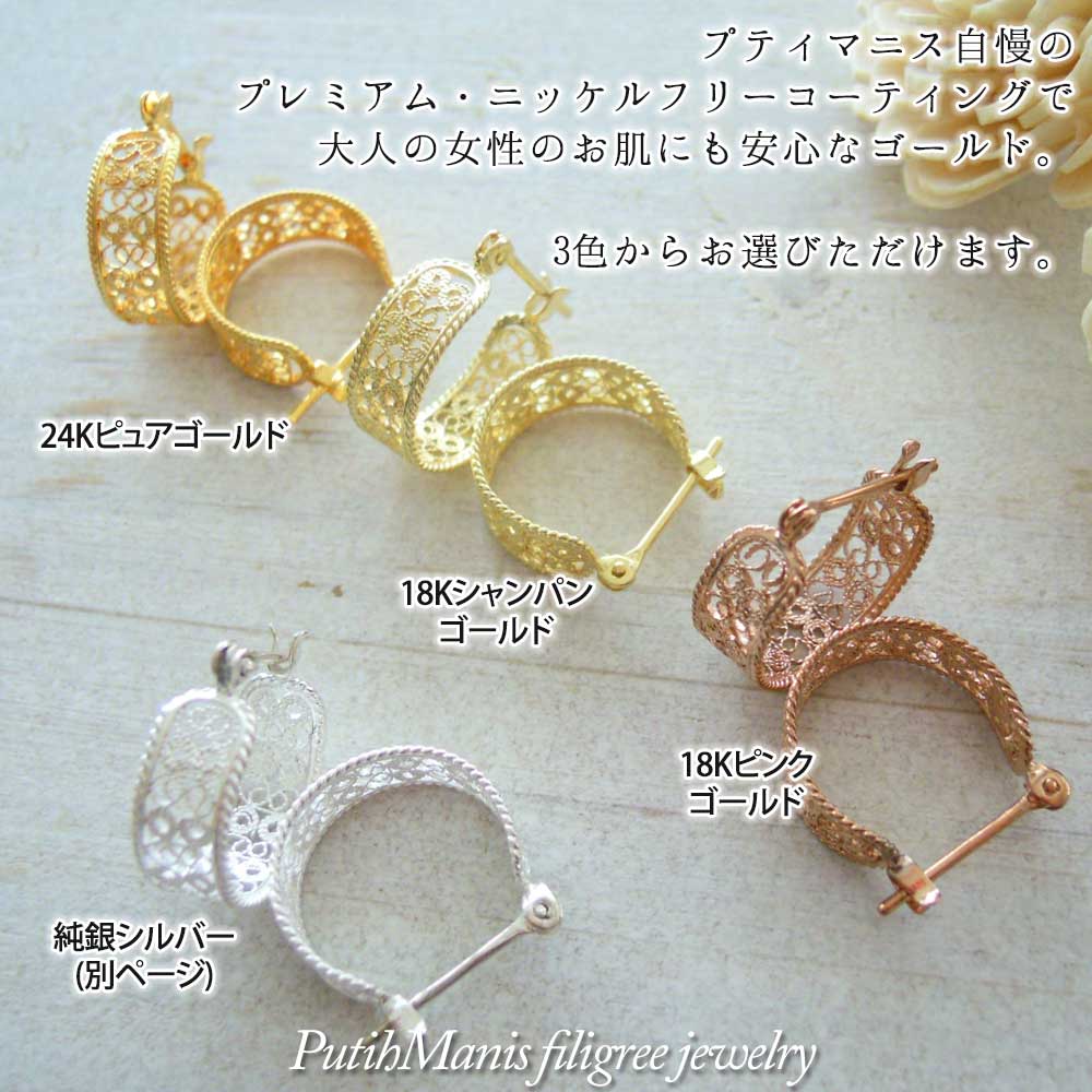 銀線細工の魅力を堪能できる透かしレースのフープピアス【フィリグリー・銀線細工】【ニッケルフリー・ゴールド】K24K/K18K