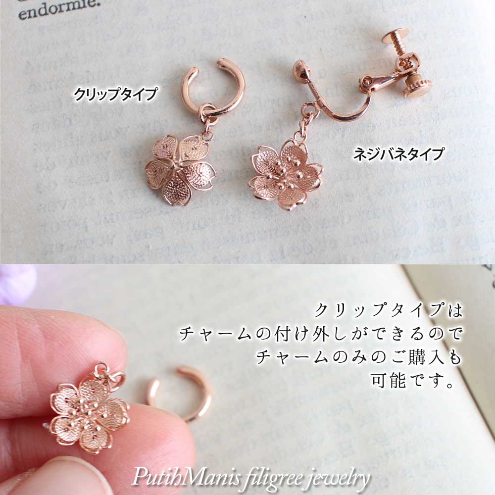 桜のチャームのドロップイヤリング|密に銀線を詰めたタイトタイプの花びら・K24GPK18GP【金属アレルギーの方に配慮したニッケルフリー加工】 [戻る]