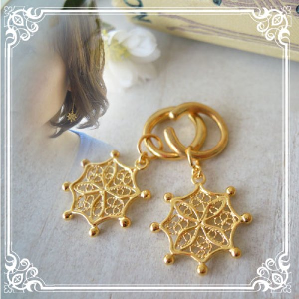 銀線細工で雪の結晶を表現しました。雪の結晶のイヤリング用チャーム・ピアス用チャーム付替えチャームで耳元のおしゃれを楽しめる。