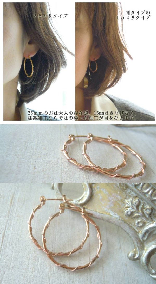 【フープピアス】プレーンに極細銀線を巻きつけた細工が美しい25mmフープピアス(ゴールド)K24K/K18K/ピンクゴールド【ニッケルフリー】【金属アレルギー】【フィリグリー】
