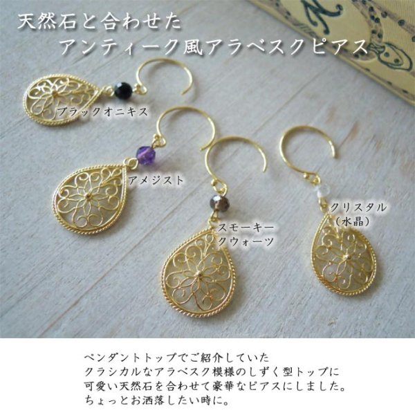 アンティークな趣のアラベスク模様のしずく型フィリグリーチャームと天然石のコンビネーションピアス18Kゴールド【ニッケルフリー】【金属アレルギー】【フィリグリー銀線細工】 [p-fil10-g]